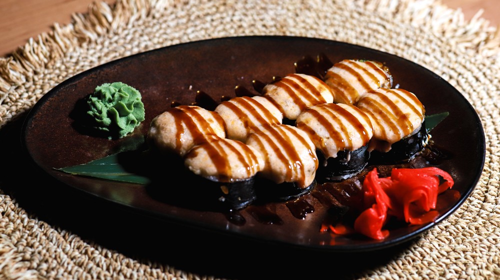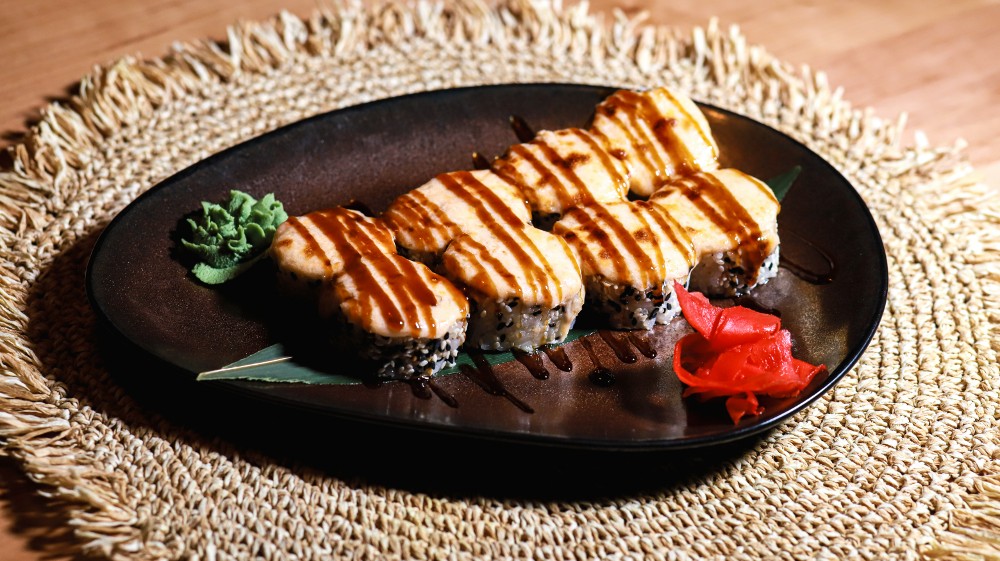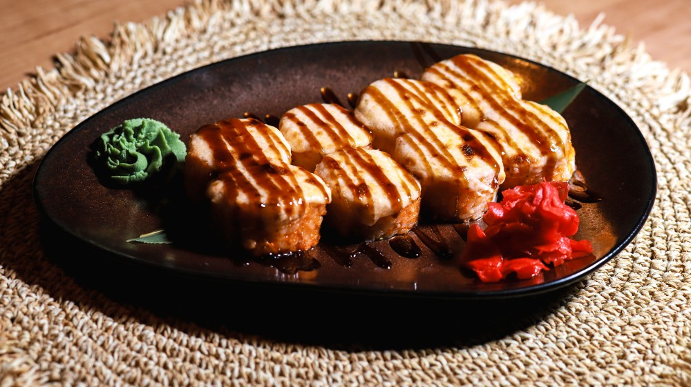 Запечений з лососем та вугрем під соусом спайсі